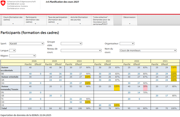 Dans le cadre du mandat de planification des cours J+S 2027, les fédérations analysent le taux d'occupation des cours et des modules en 2024. Sur la base de cette analyse, elles s’entendent avec les cantons sur une augmentation ou une réduction du nombre de places de formation dans les cours existants. En cas de besoin supplémentaire, de nouveaux cours cantonaux peuvent être demandés au moyen de la liste récapitulative.
