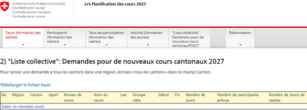 3. Demande de nouveaux cours cantonaux au moyen de la liste récapitulative: S'il n’est pas possible d’augmenter le nombre de places de formation dans les cours/modules existants, le/la RF J+S dépose une demande de cours ou module cantonal supplémentaire au moyen de la liste récapitulative.