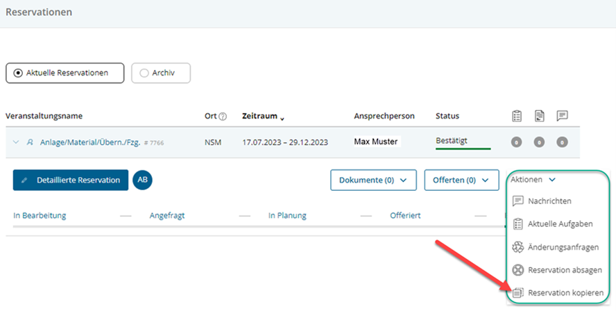 Chi ha già effettuato delle prenotazioni non deve più inserire tutti i dati manualmente. È possibile infatti ricopiare una «vecchia» prenotazione (v. figura). Il team Riservazioni riceverà quindi un ordine di copia. Non appena la «vecchia» prenotazione viene copiata, sul portale clienti comparirà la «nuova» prenotazione con lo stato «in elaborazione».